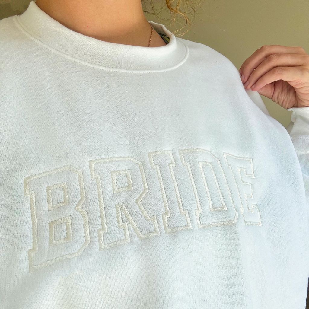 This bride sweatshirt with elegant embroidered text is the ideal choice for the bride-to-be as she prepares for her big day! This charming future Mrs. crewneck sweatshirt makes a delightful engagement gift she will treasure.