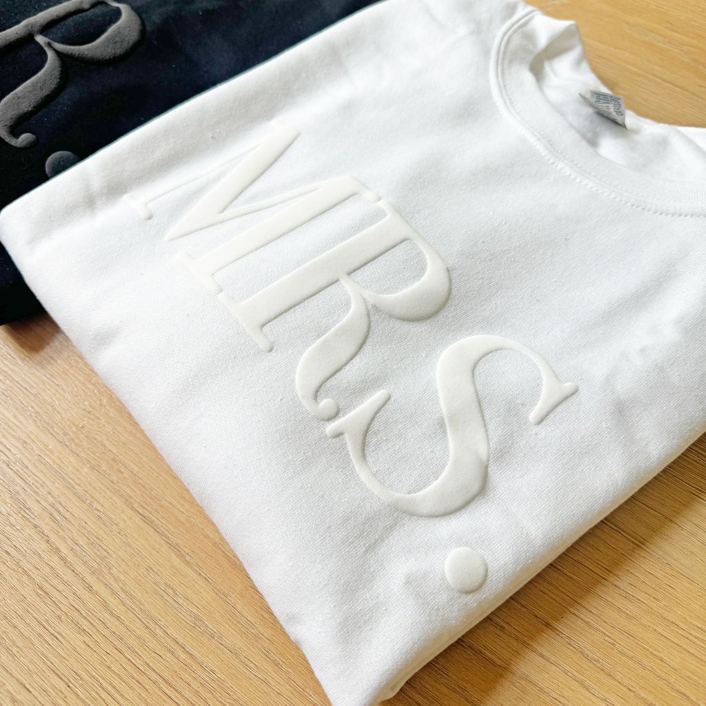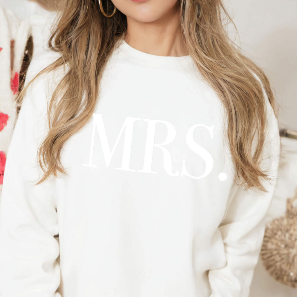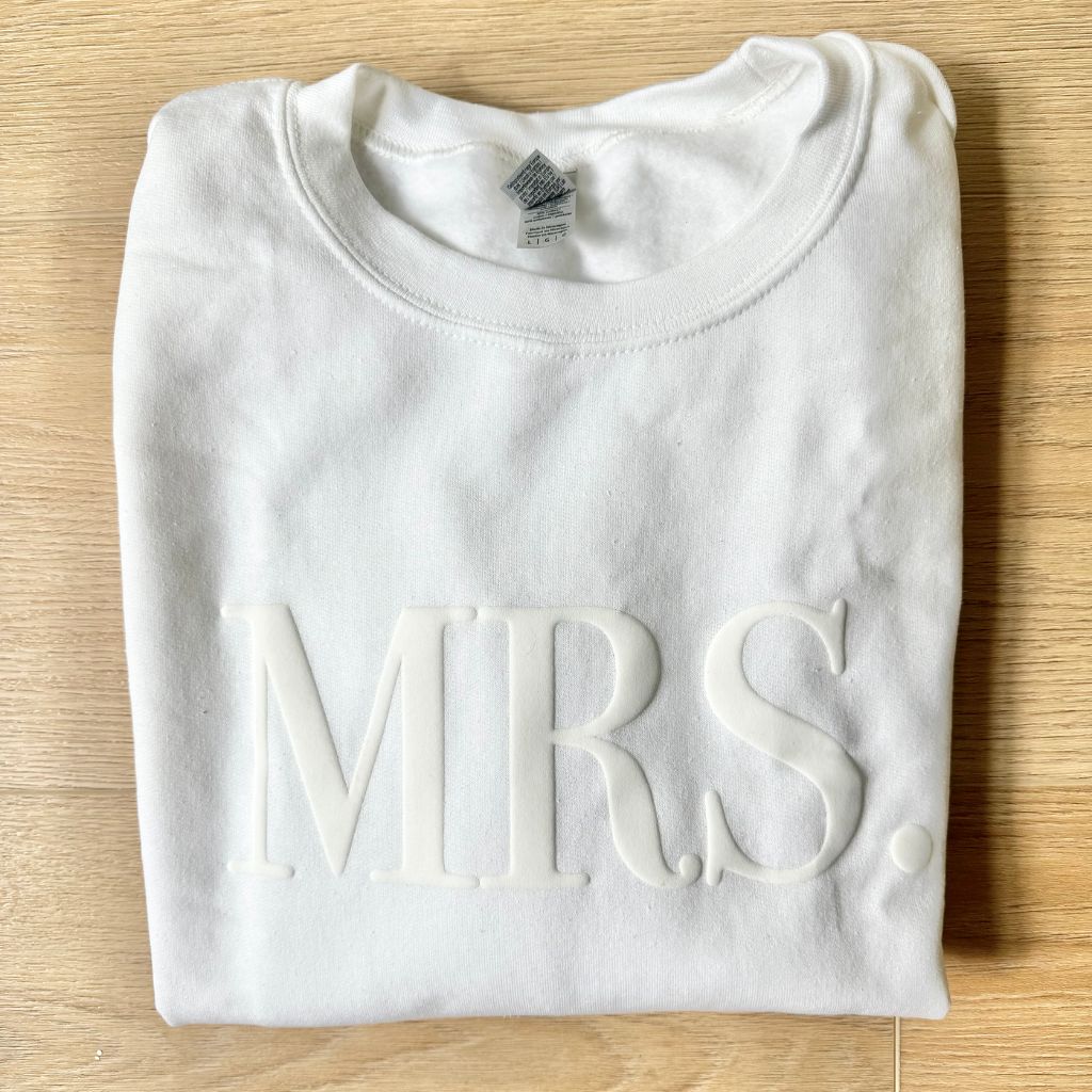 - This listing is for 1 white Mrs. sweatshirt with white embossed text.
