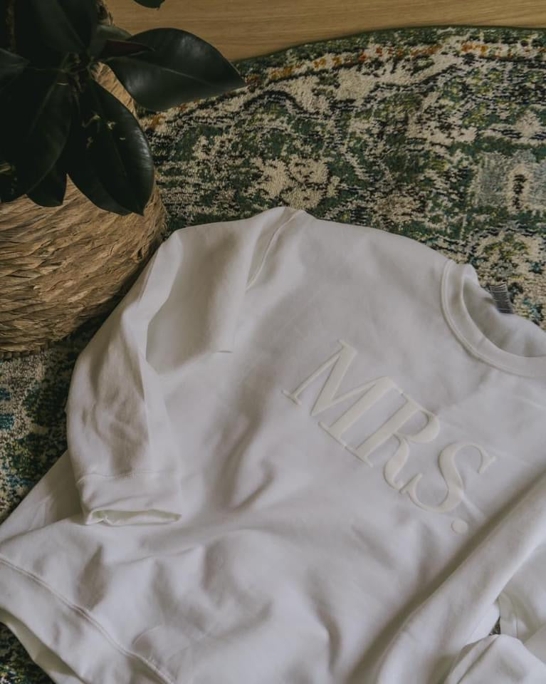 This "Mrs." sweatshirt with embossed text is the perfect item to wear while prepping for your wedding day! This future Mrs. crewneck sweat shirt is a wonderful engagement gift that she will adore!