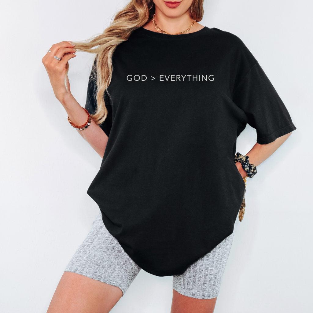 Check out our "God > Everything" Christian Comfort Colors Tee – a meaningful and stylish way to wear your faith. Featuring an inspiring "God is Everything" design, this tee serves as a daily reminder of your devotion while keeping you cool and comfortable.