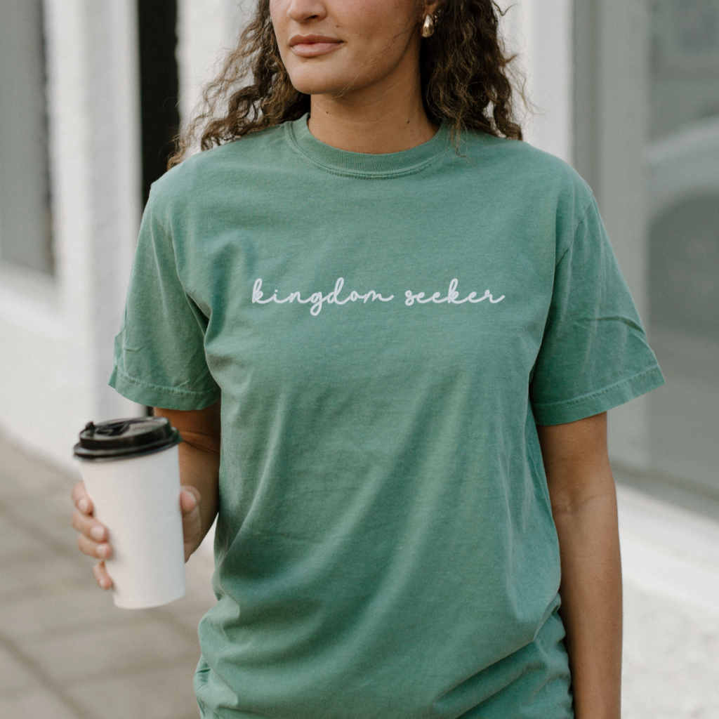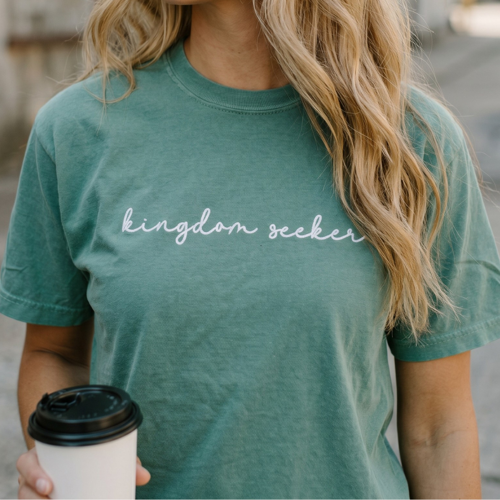 Live with purpose in our Kingdom Seeker Embroidered Christian Comfort Colors Tee — a subtle yet powerful declaration of faith. Featuring elegant embroidery across the chest, this minimalist design is perfect for those who want to share their mission to seek God's kingdom first (Matthew 6:33).