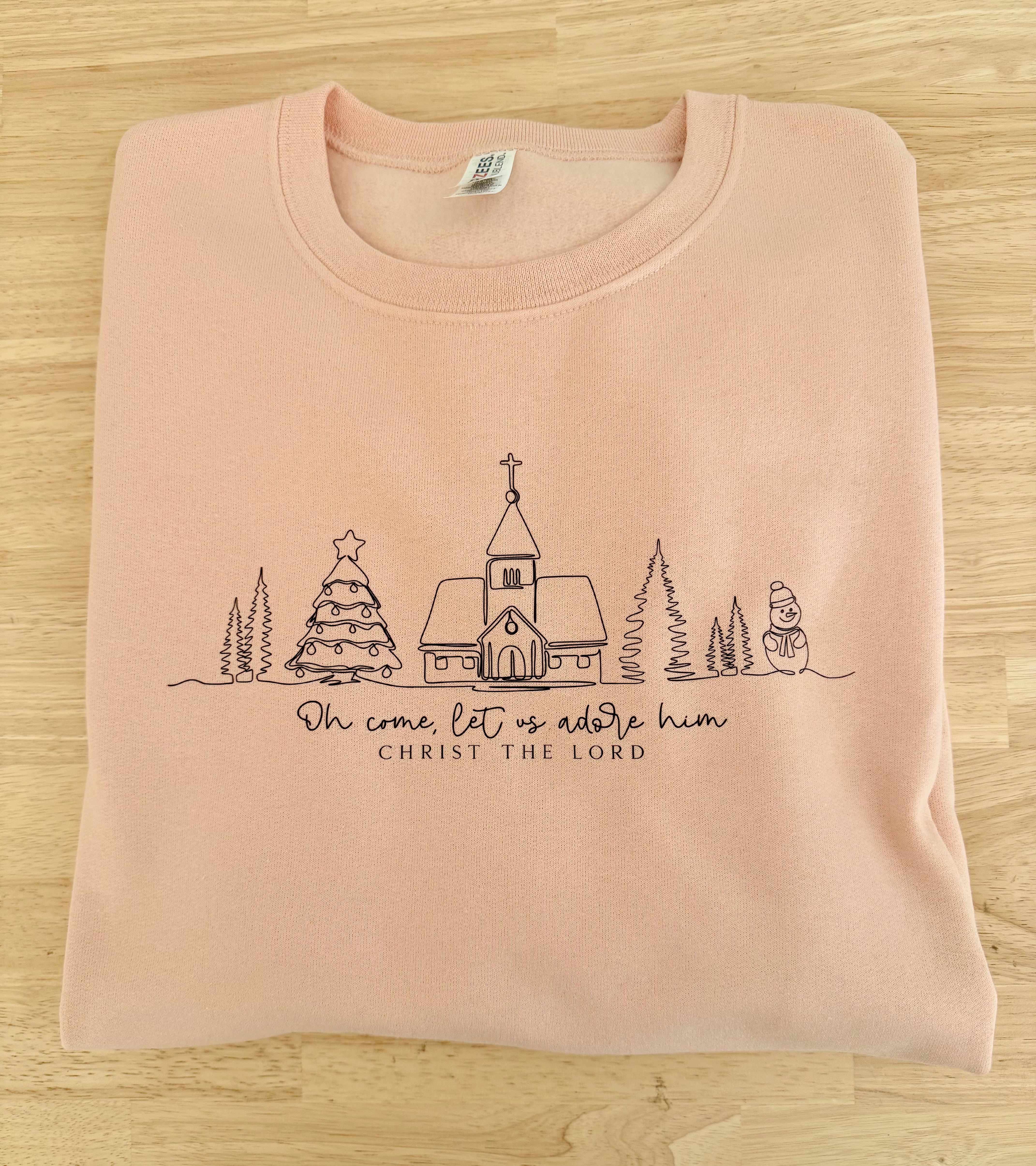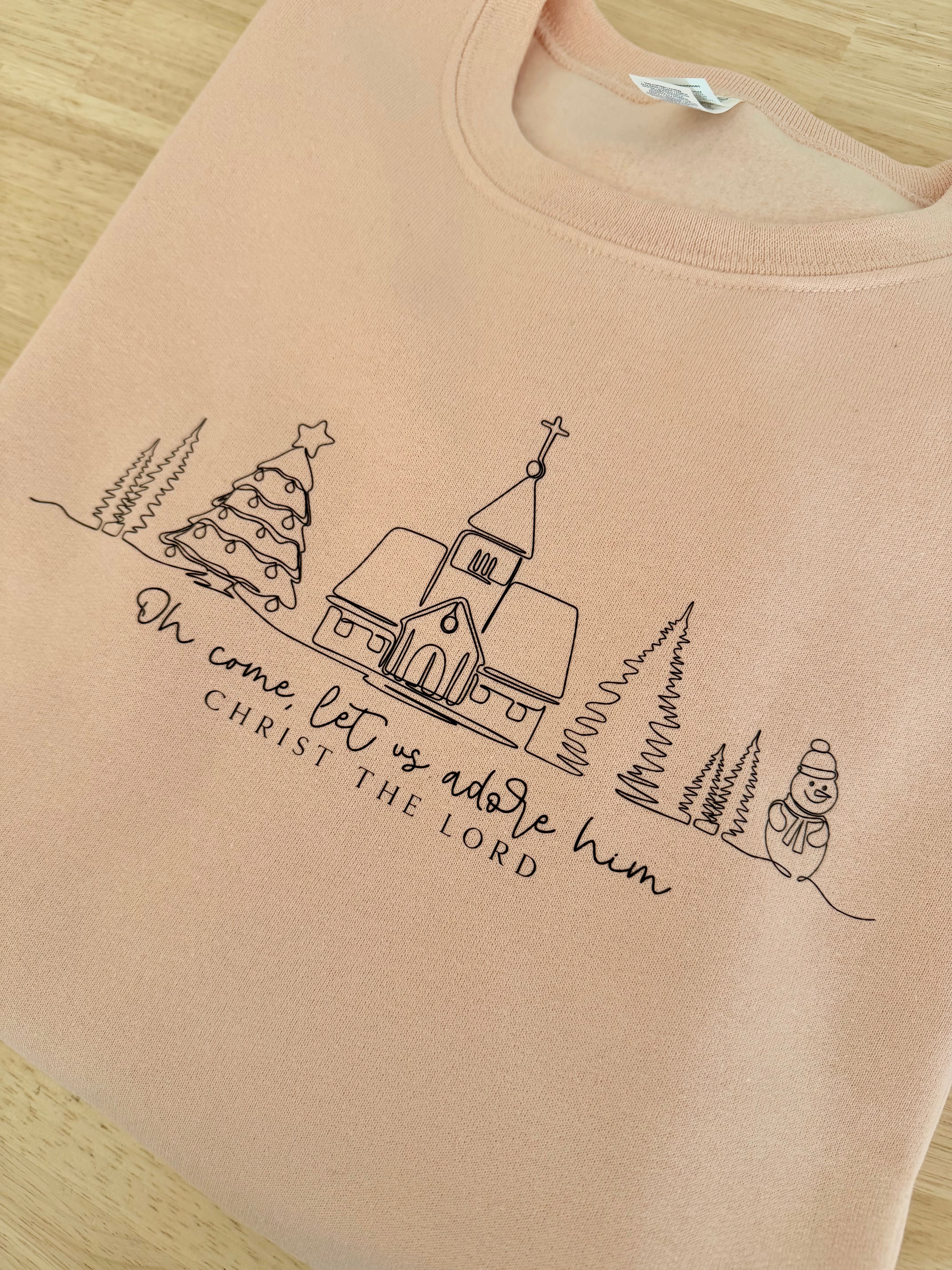 Celebrate the true meaning of Christmas with our Oh Come Let Us Adore Him Sweatshirt — a soft and cozy reminder of faith, joy, and the beauty of the season. This charming design features a simple line illustration of a church surrounded by Christmas trees and the words “Oh come, let us adore Him — Christ the Lord.”