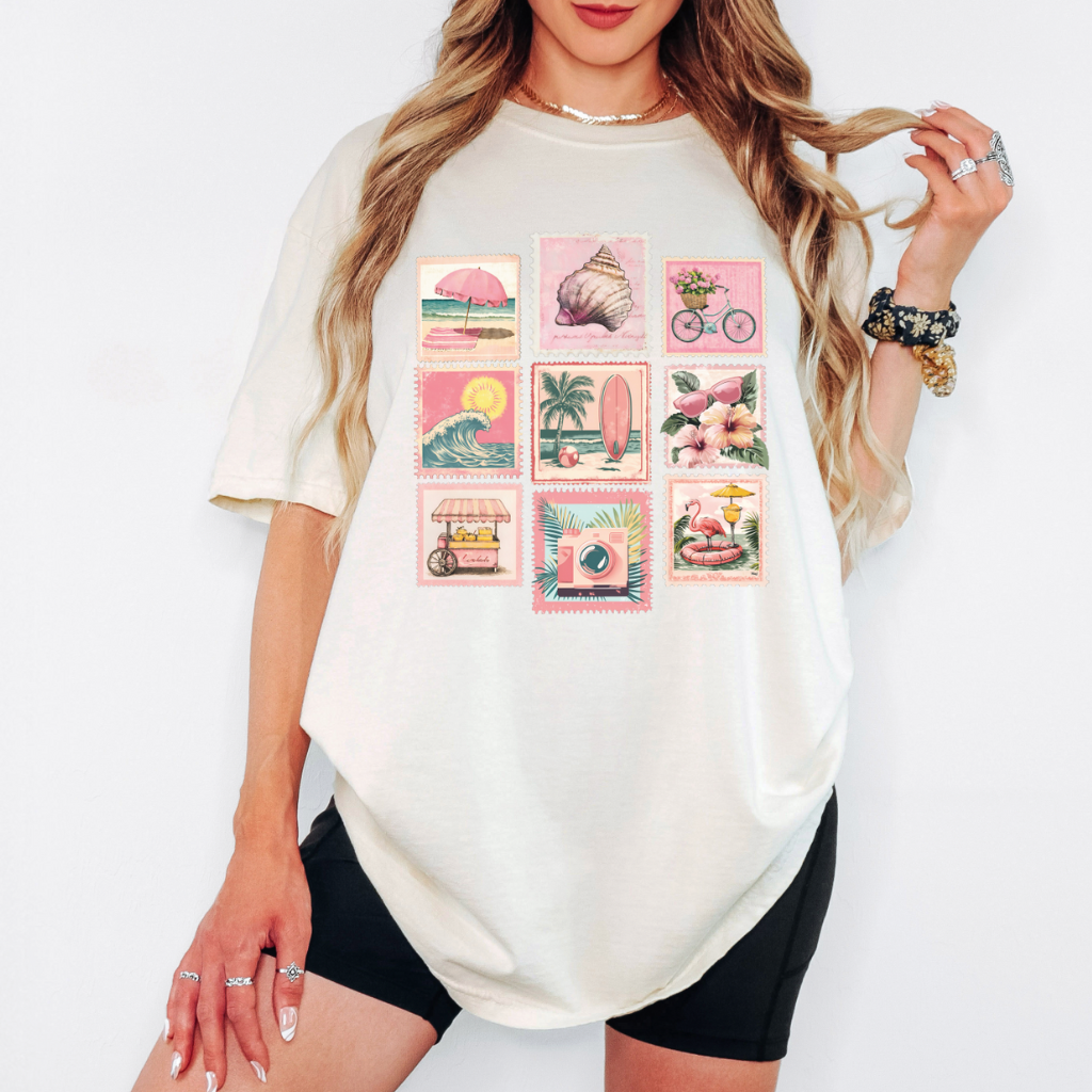 Meet your new summer fave. Our Pink Summer Beach Postcards Graphic Tee! Designed on a buttery-soft Comfort Colors shirt, this tee brings all the tropical vibes with its postcard-style print that feels straight out of a dreamy beach getaway. Featuring palm trees, surfboards, beach bikes, and pops of sunshiney pink, it’s giving girly, coastal, and carefree all in one.