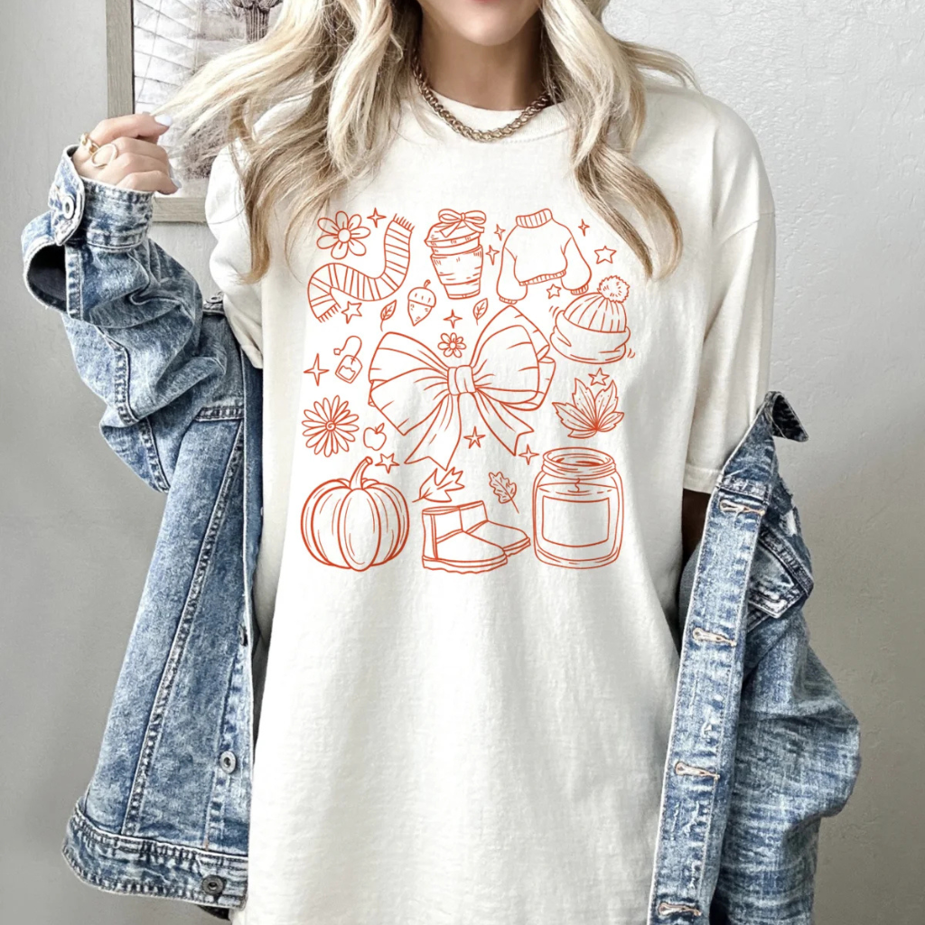 If you live for falling leaves, pumpkin-flavored everything, and soft comfy tees, this Fall Season Essential shirt is for you. With soft florals and pumpkins in warm autumn tones, it captures everything we love about the season in one cute graphic. Dress it up or down—it’s a fall go-to you’ll reach for again and again.