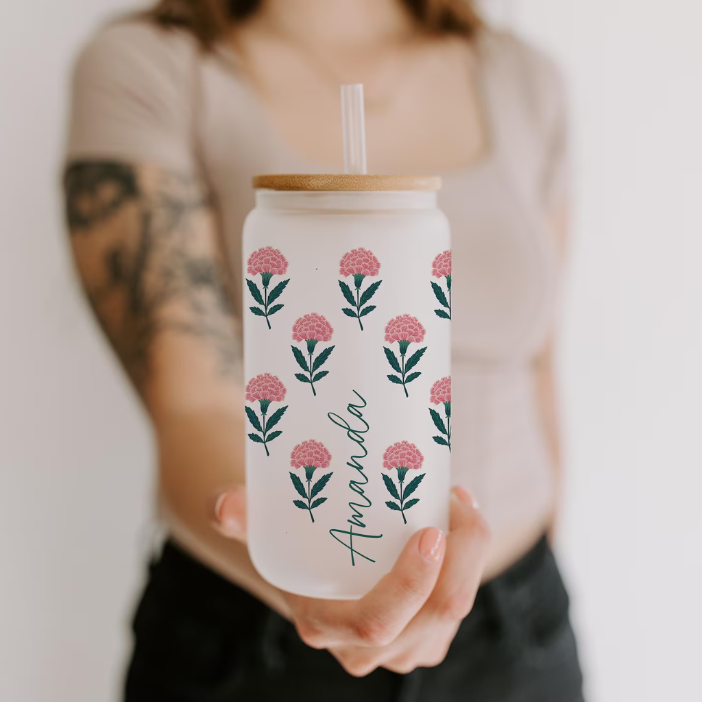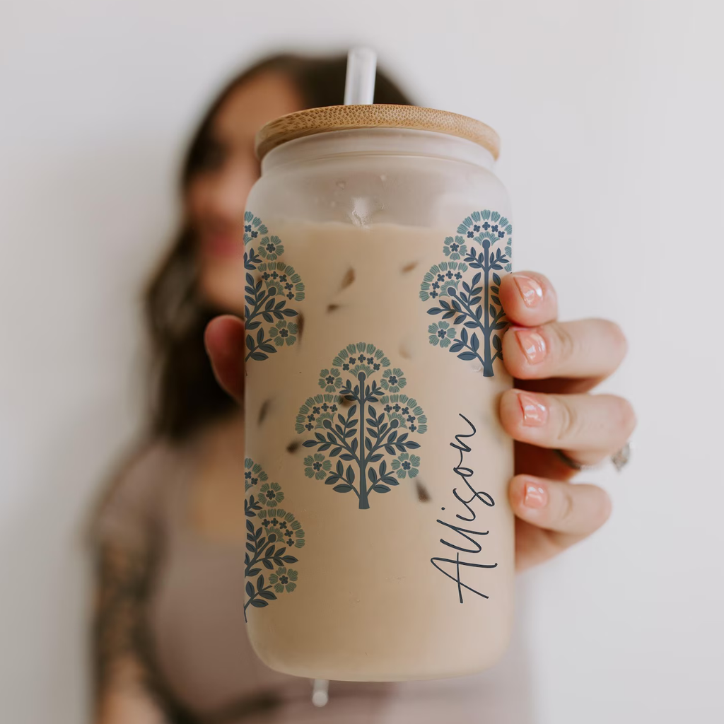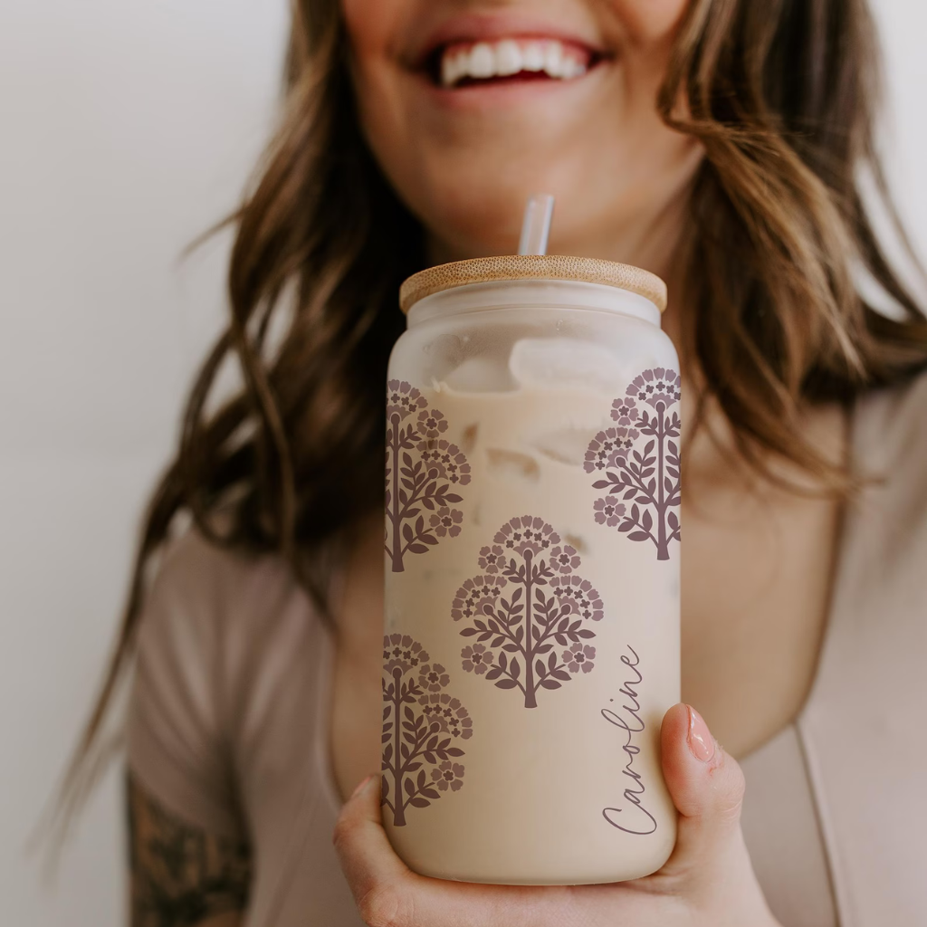 Sip in style with our Personalized Block Print Glass Tumbler with Bamboo Lid and Straw, the perfect mix of beauty and function. Each custom iced coffee glass features your name in elegant script, making it an ideal bridesmaid gift, proposal surprise, or everyday favorite. Durable, reusable, and chic, this glass cup is designed to keep your drinks stylish while creating a keepsake that lasts.