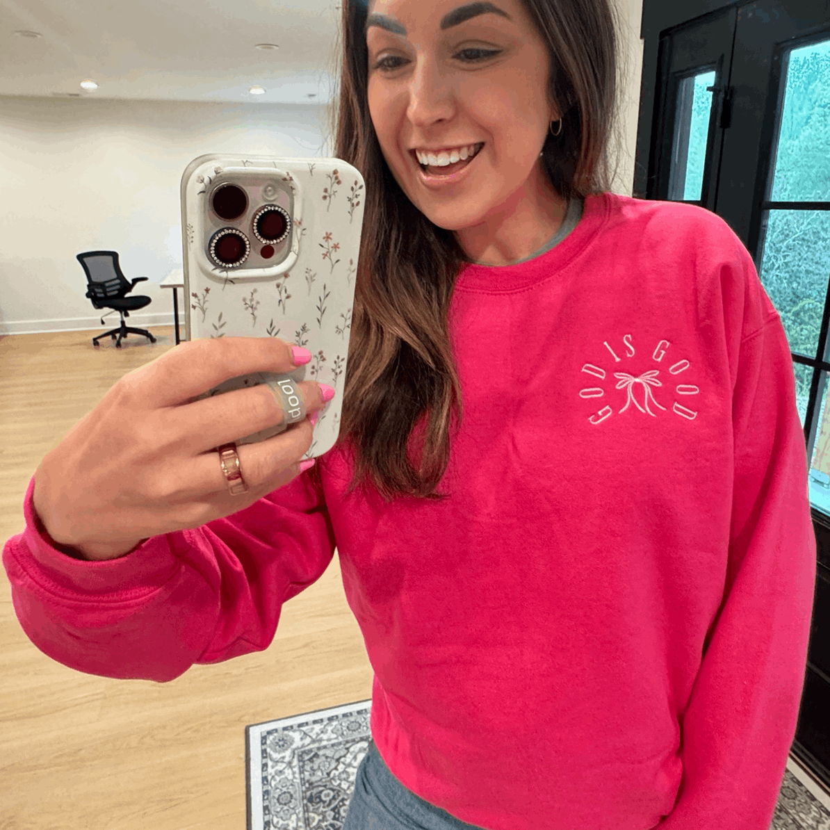 Show off your faith in style with our God Is Good Bow Sweatshirt – a bold and joyful reminder of God’s goodness, wrapped in a cute, preppy design. This hot pink Christian crewneck features a minimal front graphic with a sweet bow detail and uplifting message that’s perfect for everyday wear, church events, or gifting to your favorite faith-filled bestie.