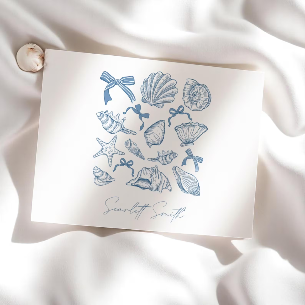 Bring coastal charm to your correspondence with our Women’s Personalized Stationery Set featuring delicate sea shell designs. This custom notecard set includes folded notecards perfect for heartfelt thank you notes or sunny summer messages. A thoughtful and breezy gift for her, this sea shell stationery set adds a personal touch to every note she sends.