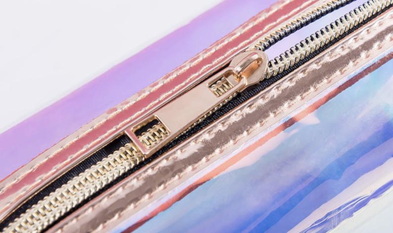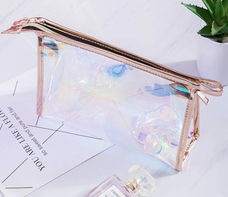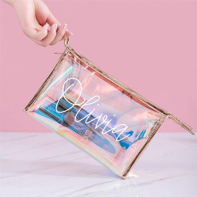 These gold bridesmaid makeup bags with a clear holographic siding are a unique bridesmaid gift and wedding keepsake or gift to a friend for their makeup. This personalized makeup bag and bridesmaid bag is a stylish way of giving a gift or simply saying thank you to someone you love.