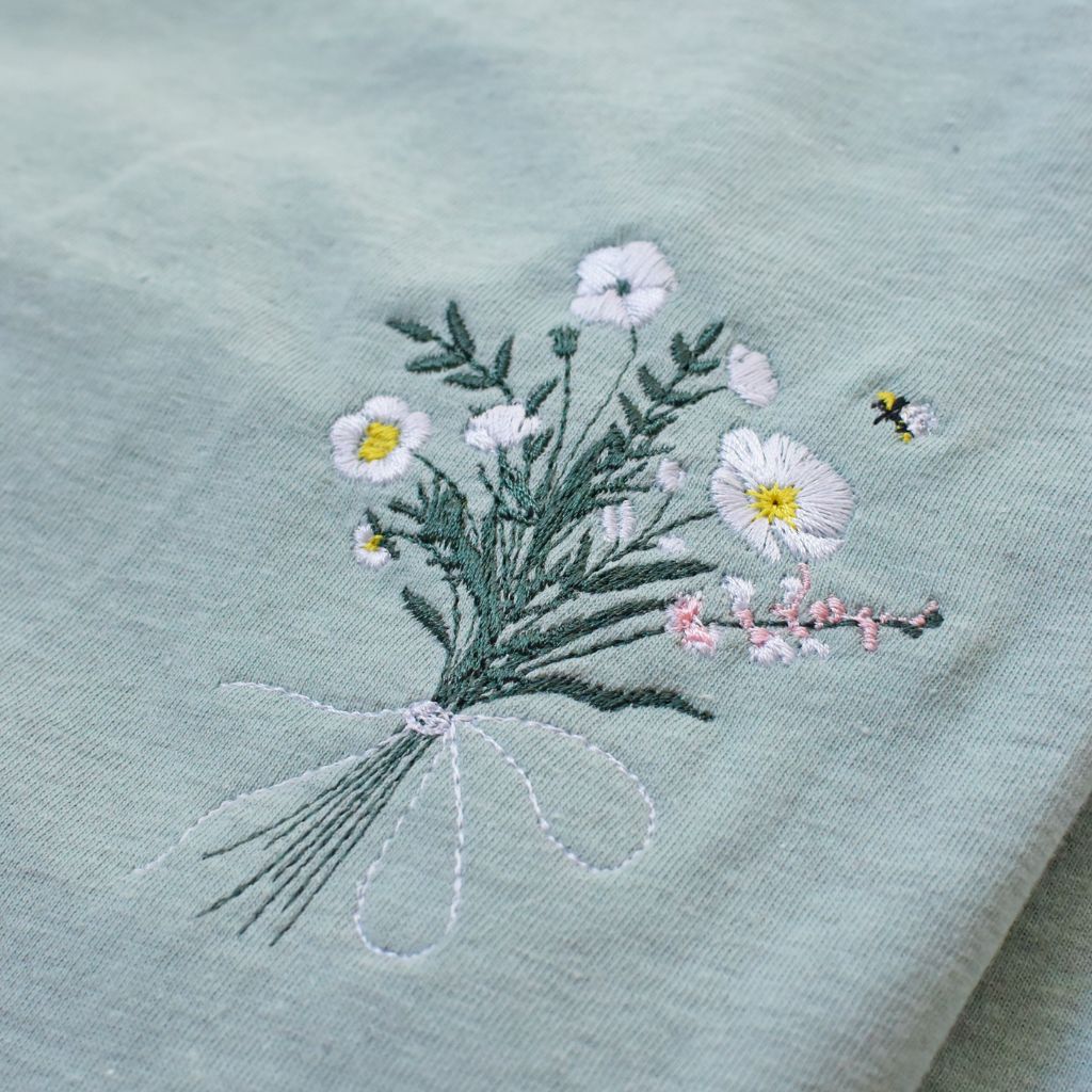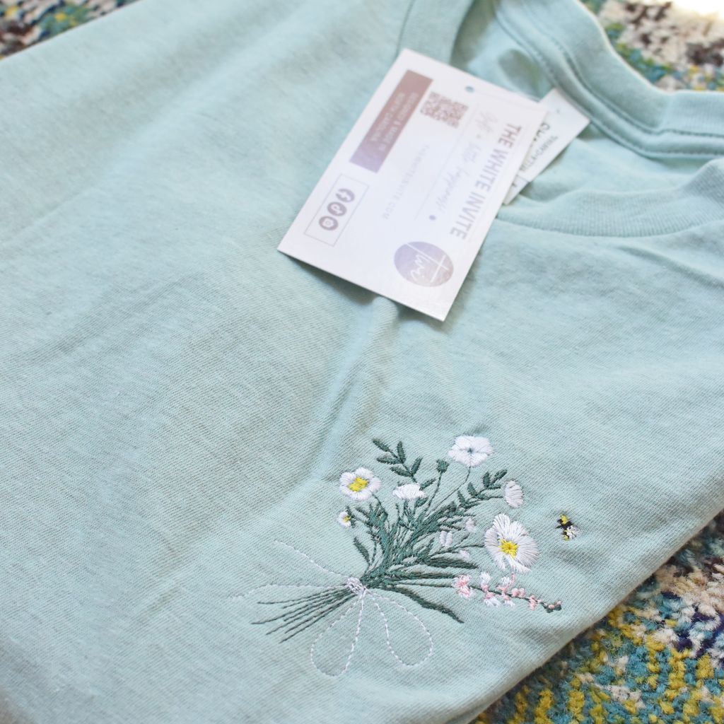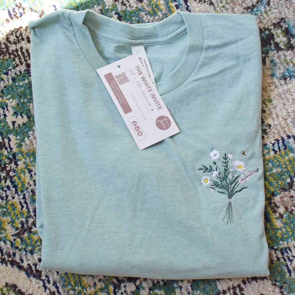 This charming tee features a beautifully embroidered floral bouquet design that adds a touch of elegance and whimsy to your everyday look. Crafted from soft, high-quality fabric, it ensures comfort and breathability, making it perfect for warm, sunny days.