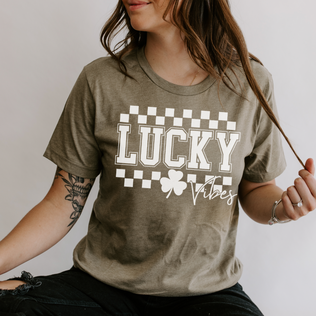 Introducing our "Lucky Vibes Women's Graphic Tee" - a must-have addition to your wardrobe for all seasons!