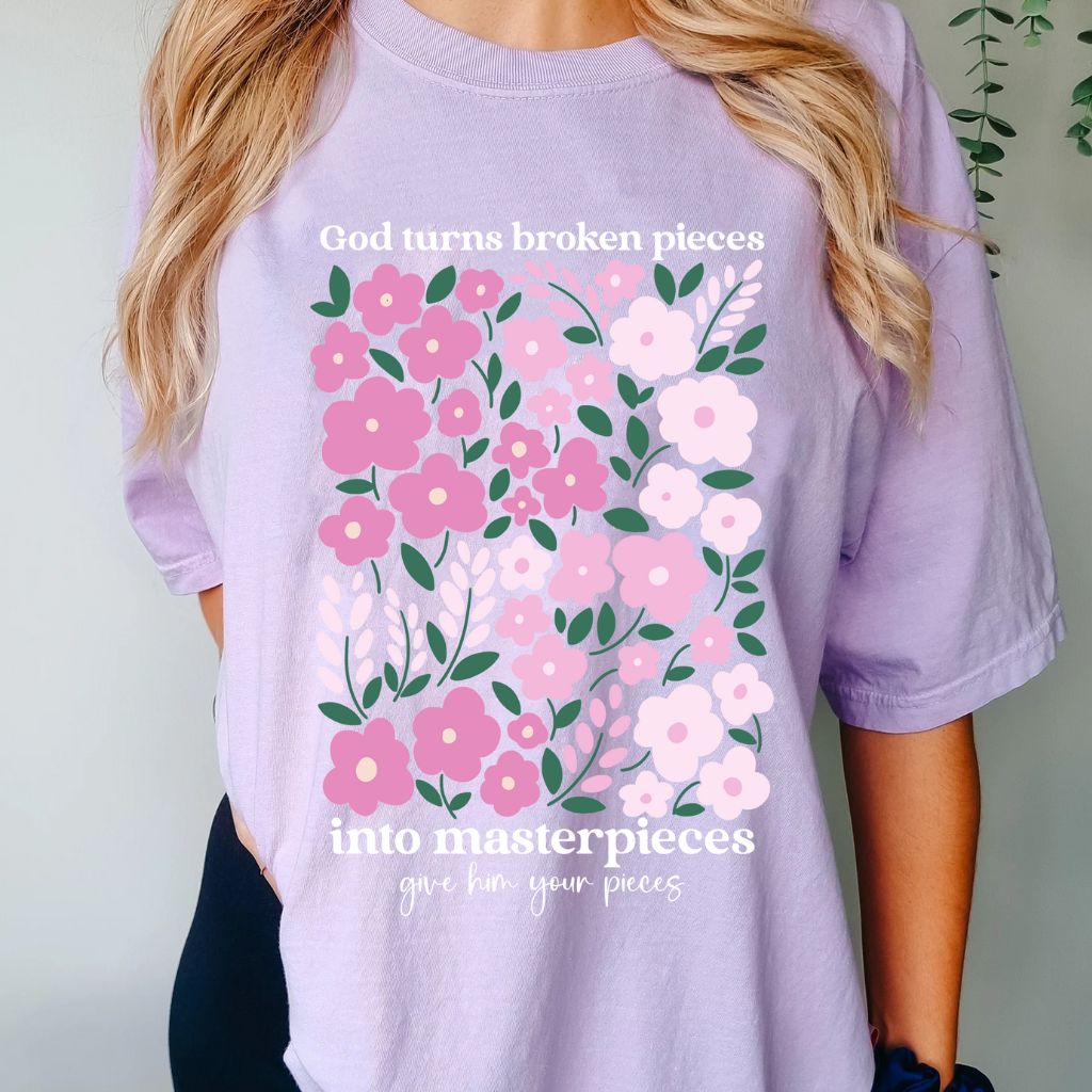 Embrace the message of hope and restoration with our "God Turns Broken Pieces into Masterpieces". This inspiring graphic tee is designed to remind you that no matter how broken you may feel, God has the miraculous ability to turn your struggles into beautiful masterpieces.